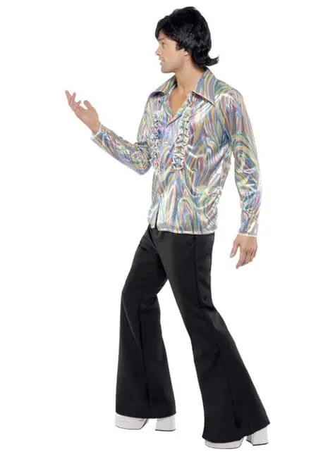 Beinhaltet eine schwarze Schlaghose und ein gemustertes Hemd mit hohem Kragen.