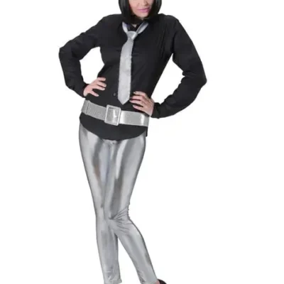 Beinhaltet einen eng anliegenden Overall in Schwarz, einen silbernen Gürtel und ein schwarzes Kopfband.