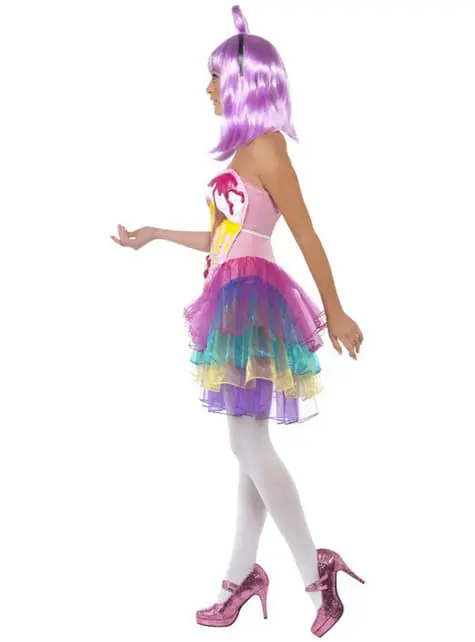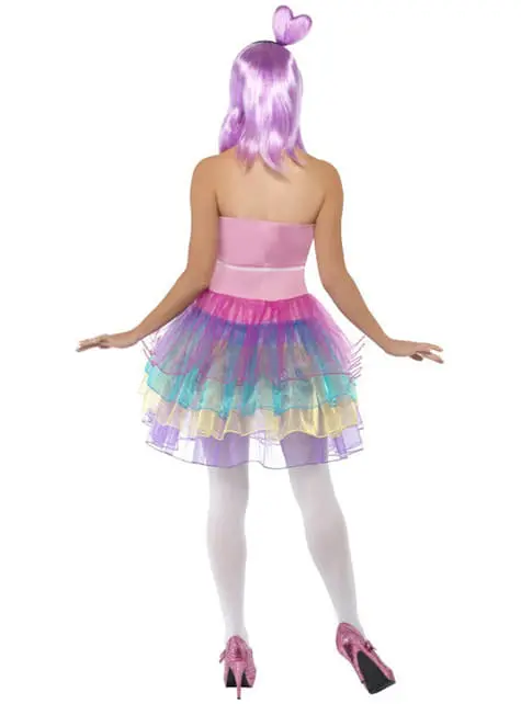 Beinhaltet ein Brustteil aus Latex mit aufgedruckten Süßigkeiten und ein Kleid mit verschiedenen Farben.